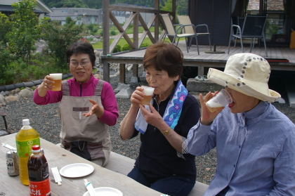 | 野田酒造の焼酎と小崎さん持参の氷がドカーン | 女性もかんぱーい |