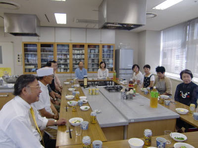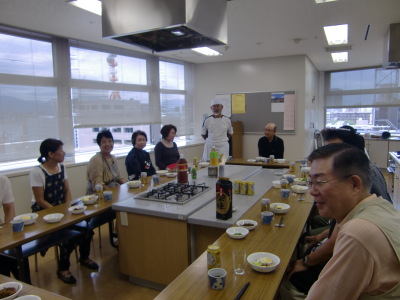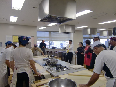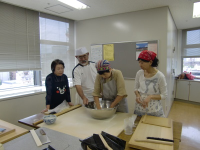 まず、蕎麦打ちは深松名人と福岡蕎麦の会の楠田さん指導により3グループで北海道沼田産の新蕎麦粉を使用しニ八蕎麦を打ちました。特に、きくもみや蕎麦切り包丁の使い方等きめ細かい指導があり見るからに美味しそうな手打ち蕎麦が完成しました。