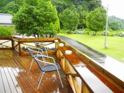 大きなウッドデッキが温もりを感じさせるお宿でしたが、2年ぶりで戻ったその姿は、さらにウッドデッキがバーベキューを楽しんだお庭にまで伸びて、すごいことになっていました。手入れが大変だろうなあーって、要らぬお世話ですね。打ち水がしっかりされていて、わざわざ濡らしていいのだろうかと、これも要らぬ心配。